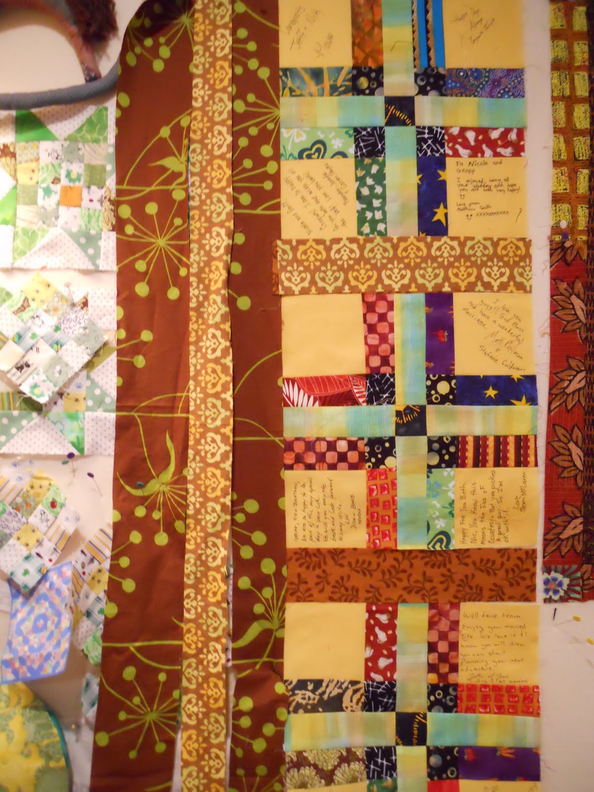 I am trying to make this wedding quilt. The last post had it latticed with the green which did not work...I am trying to tone down the yellow and make the quilt more conservative. So I am auditioning the light brown lattice and the darker brown lattice between the blocks. I am really not sure that either work and that maybe this quilt is just too conservative now or just plain ugly. One thing I realize is that the design wall is too crowded and that I need to audition more sections of the choices in order to really tell. I do love scrap quilts...my favorite, but they are certainly more of a challenge.