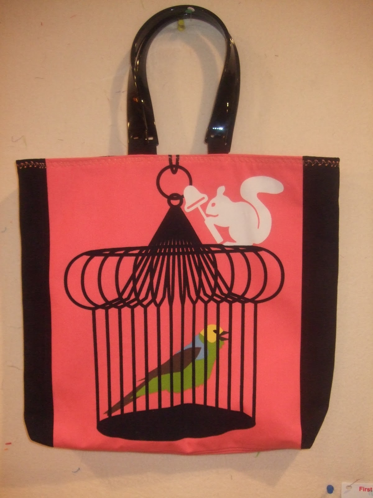 The two sides of the bag and a close up of the handles attached to the bag with black elastic. I just happened to have the right size in a basket.