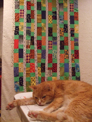 There was a small turn around tonight TBTG...so I celebrated with finishing the blocks on this comfort quilt. As you can see, I am not sewing alone. I am going to take down that nice ledge I made for the cats to rest on while they adjusted to the new dog. I can see that Milito at least, would rather help me sew.